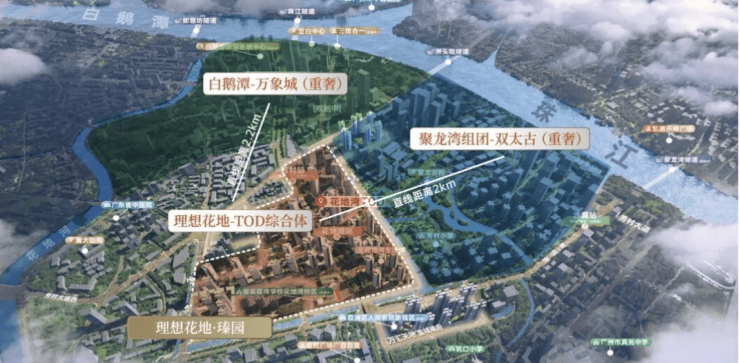 项目位于广州规划打造的世界级五大商圈之一——白鹅潭CBD,紧邻花地湾组团和聚龙组团,半径约2公里范围内形成珠江西岸CAZ黄金三极。这一区域作为国家级战略支点,未来将建设产商住一体化城市中央商务区,商业、办公及高端居住资源高度集中,发展潜力巨大。