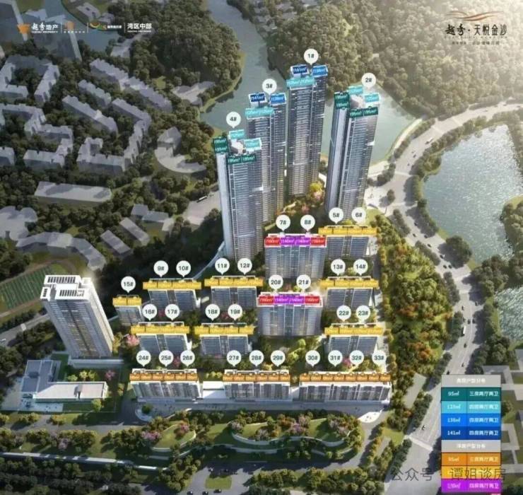 户型:小高层95㎡/125㎡三四房、超高层96㎡三房、125㎡/141㎡四房、底叠150-200㎡三四房