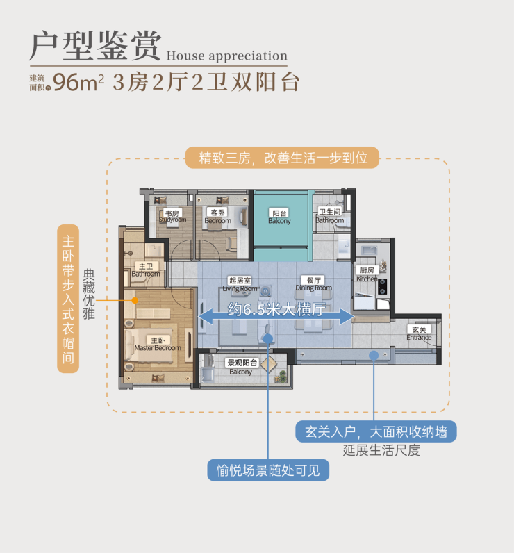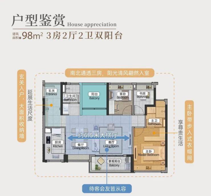 约96㎡南北通透四房:6.5米大横厅,主卧带步入式衣帽间,一步到位改善需求;