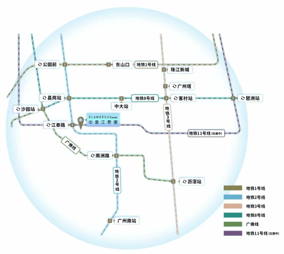 交通便利度,从来都是衡量楼盘价值的核心指标,而中海江泰里的交通优势,足以让很多楼盘望尘莫及。项目距离地铁2号线江泰路站仅150米左右,步行几分钟就能到达,真正实现“出门即地铁”。更值得期待的是,这里还是双地铁上盖,未来可换乘在建的11号线广州环线,这条环线串联起天河、白云、荔湾等多个区域,无需多次换乘就能通达全城。从这里出发,7站就能到达广州南站,轻松开启城际出行;7站直达琶洲互联网创新集聚区,对于在琶洲工作的年轻人来说,通勤时间大幅缩短。除了地铁,自驾出行也十分便捷,周边有江南大道、江燕路、工业大道、新滘西路、内环路五大主干道串联主城,经江南大道可畅享江南西商圈;经江燕路接驳工业大道,能快速抵达太古仓、同福西及沙园;经新滘西路接驳广州大道,便捷通达珠江新城;经内环路可连接越秀、天河,经东晓南接驳高速,还能快速抵达佛山等区域,无论是日常通勤还是周末出游,都能畅行无阻。