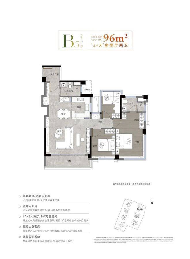 【建面约 96 ㎡ 3+X 房两卫】建面使用率高达 110-118%(套内使用率 138-148%),使用面积约 111-115 ㎡,