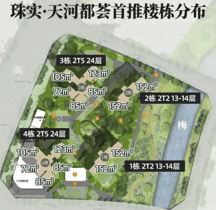 项目容积率低,预计推出 12 栋住宅,户型涵盖 72 - 152㎡的三至五房,满足不同家庭结构的需求。户型使用率高,部分超 120%,为天河智慧城首个超新规户型。首期推出 108 地块,包含两栋 2 梯 5 户的 24 层高层,以及两栋 2 梯 2 户的 13 - 14 层小高层,共约 284 套。其中,建面约 85㎡和 152㎡货量居多,152㎡户型更是一梯一户的南北对流纯板楼,适合中心区改善群体