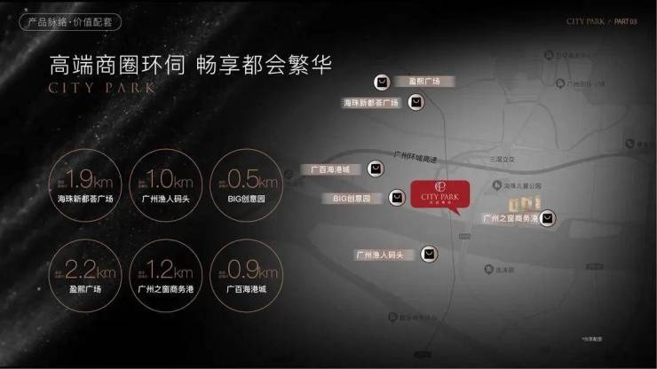 现有商业:周边成熟商圈,满足日常需求:项目周边现有多个成熟商圈,实测距离海珠新都荟广场约1.2km,步行约15分钟,驾车约5分钟可达,广场内设有大型超市、品牌服饰、餐饮、儿童游乐等业态,满足业主日常购物、餐饮等需求;实测距离盈熙广场、渔人码头约1.5km,步行约20分钟,驾车约6分钟可达,渔人码头主打特色餐饮、休闲观光,是业主周末休闲聚餐的好去处;北侧东晓南商圈实测距离约2km,驾车约7分钟可达,业态丰富,可满足业主多样化的消费需求。