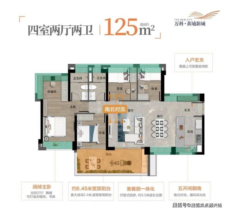 而建面约105㎡产品,做到了四房两卫,约6.35米的阳台空间更宽阔,主卧采用了双飘窗设计,空间更富足。