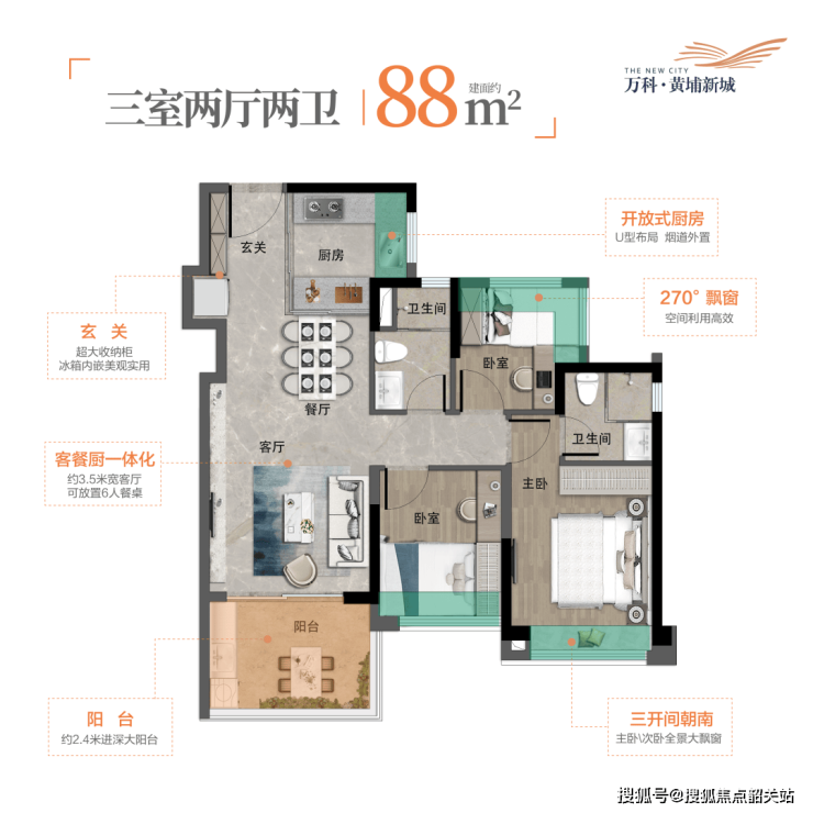 88㎡三房:南北通透,主卧带独立卫浴,得房率82%;