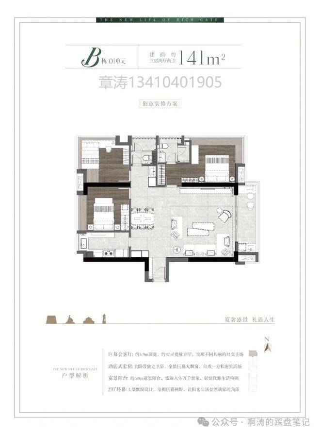 住宅产品设计层面,公园前·君熙府采用现代城市高端公寓结构逻辑。主力户型面积约115至196平方米,空间尺度更适合家庭长期居住需求。社区采用2梯3户结构,提升私密性与通行效率。室内空间强调大尺度客厅设计理念,部分户型客厅面宽可超过5.8米,形成开阔空间视野。270度环幕视角设计可以最大化城市景观观赏体验,使居住空间兼具功能性与审美价值。开发商名称(以下简称“我们”)授权发布本项目解读内容,项目营销、工程、法务三大部门已联合核验所有数据。