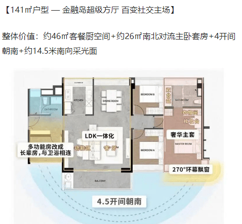 141㎡超级方厅户型:约 46㎡客餐厨一体化空间连通南向阳台,形成 14.5 米超大采光面;主卧套房配备独立卫浴与书房,空间尺度媲美 160㎡户型。