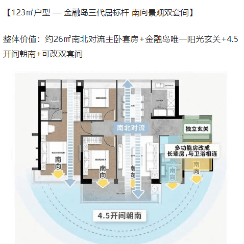 123㎡三代居标杆:4.5 开间朝南,南向面宽达 13.2 米;约 26㎡南北对流主卧套房带步入式衣帽间,阳光玄关面积达 3.5㎡,且可灵活改造为双套间,满足多代同住需求。
