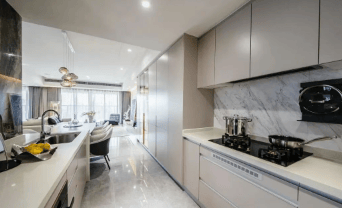 在室内设计上,云山壹品融入了意式高雅风格,金属展示格的运用增添了空间的精致感与优雅气质,打破了传统柜体的沉闷。厨房采用 LDK 式格局,将起居室、饭厅与厨房巧妙融合,不仅让视线更通透,空间利用率大幅提升,更打造出家庭核心互动区 —— 家人可在烹饪时交流,用餐时分享日常,无形间拉近了彼此距离。同时,设计师还贴心地将烟机、冰箱、洗碗机等家电隐藏,让厨房线条更流畅,整体视觉效果更统一。