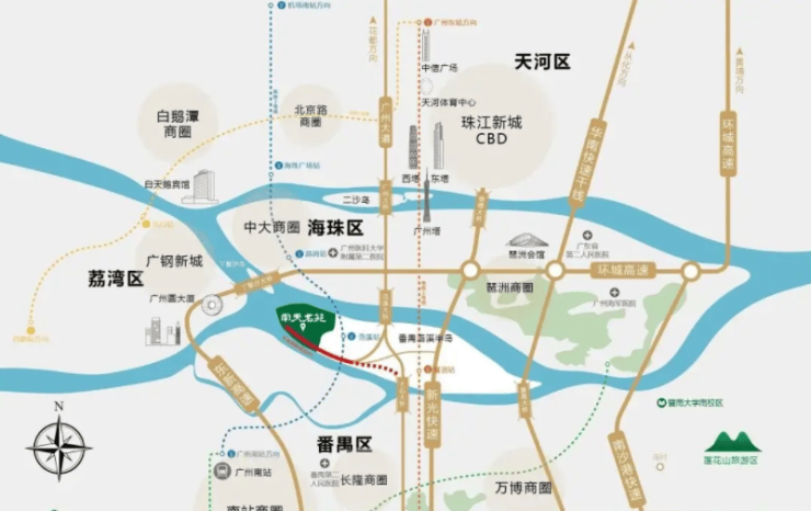 除了江景资源,南天名苑的地理位置还体现在其便捷的交通网络上。项目距离地铁 2 号线洛溪站约 3 公里,周边 3 公里内覆盖 6 个地铁站,多条公交线路直达小区门口。这种高密度的轨道交通网络,为业主的日常通勤提供了极大的便利。无论是前往珠江新城、万博还是琶洲,都可以通过接驳交通快速换乘轨交,实现高效出行。自驾方面,经南大干线、东新高速等路网,30 分钟内可畅达珠江新城、万博、琶洲三大 CBD,1 小时内覆盖大湾区主要城市。这种“半小时生活圈”的构建,使得南天名苑既能够享受岛居的静谧,又能便捷接入城市核心生活圈。