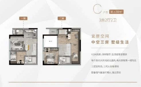 C户型:建筑面积约58㎡,三房布局,配备独立厨房,享受墅级生活体验。