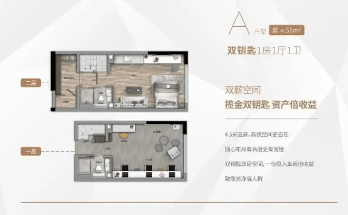 A户型:建筑面积约51㎡,双钥匙设计,一房一厅一卫,适合追求资产收益的人群。