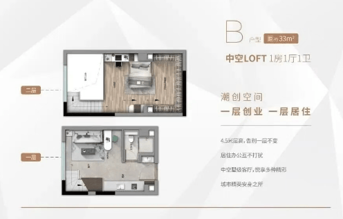 B户型:建筑面积约33㎡,中空LOFT设计,一房一厅一卫,实现居住与创业两不误。