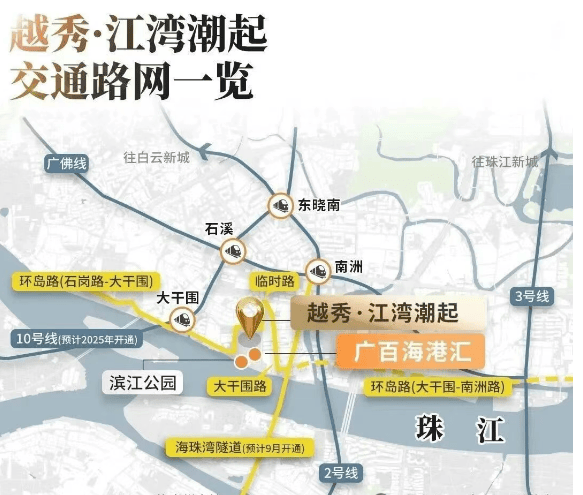 项目直线距离地铁10号线大干围站仅约650米(百度地图实测),步行8-10分钟即可抵达。10号线作为贯穿广州南北的黄金动脉,直达五羊邨、滨江东、体育西路、天河客运站等核心商圈,未来还可换乘多条线路无缝衔接全城。更关键的是,海珠湾隧道已于2025年底正式通车,从项目出发经隧道至广州南站仅需约15分钟车程,极大提升广佛及高铁出行效率。此外,项目门前的环岛路(石岗路-大干围段)已于2026年初开通临时通道,彻底打通片区断头路,缓解区域拥堵。无论是日常通勤、商务差旅还是周末出游,江湾潮起都构建起“地铁+隧道+主干道”三维立体交通网,真正实现“快进快出、畅达全城”的高效出行体验。