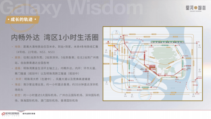 星河智荟二期地处明珠湾板块慧谷西区,距离大涌地铁站仅数百米,出行极为便利。项目周边规划多条地铁线路,包括现有的4号线以及未来规划的NS2、NS3等线路,能够快速直达广州主城区及南沙其他核心板块。同时,项目紧邻明珠湾大桥约2公里,内环、外环及跨江隧道贯通,便捷连接环市大道、蕉门隧道、莞佛高速、凤凰大桥等多条干线,形成高效立体交通网络,居民可快速抵达番禺、天河及珠江新城核心区,满足工作及生活多重通勤需求。