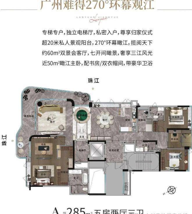 户型设计尽显奢华与舒适,仅提供 193㎡和 285㎡两种大户型,虽选择范围较窄,但却精准定位高端圈层。193㎡四房户型,LDKG 一体化宽厅设计,让空间更加开阔通透,双套间主卧均瞰江,近 17㎡观景阳台,可饱览江景,享受惬意生活。285㎡五房户型更是奢华至极,270° 环幕江景阳台,将江景尽收眼底,约 60㎡双景会客厅,彰显尊贵大气,主卧配备书房及双衣帽间,满足高品质生活需求,为业主打造专属的私密空间,尽享豪华居住体验。