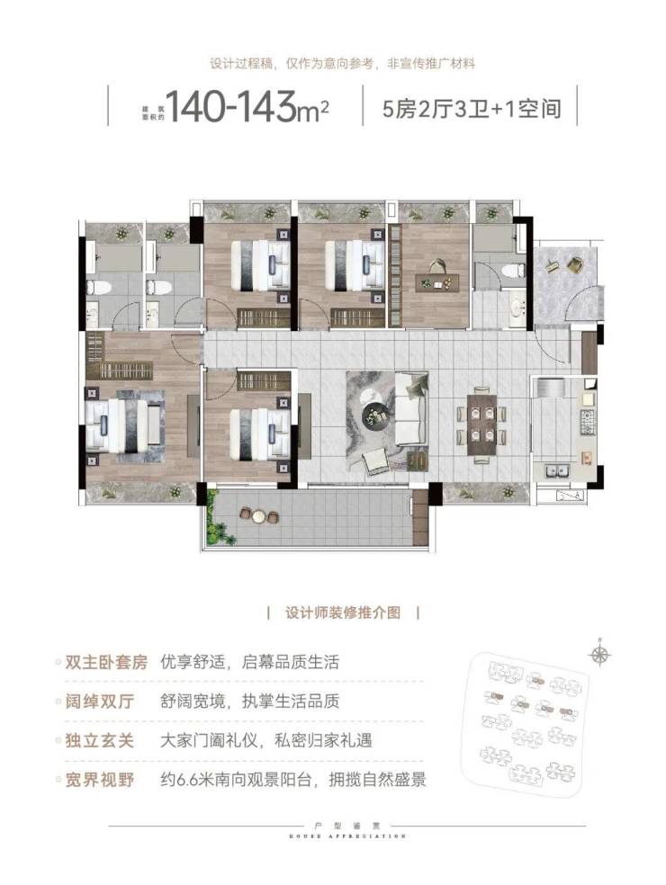大平层产品:建面约190㎡,360°景观视野,北向头排望月亮湖,西南侧望中心湖与太阳湖,南望中心园林,高层可尽览广州城市天际线。