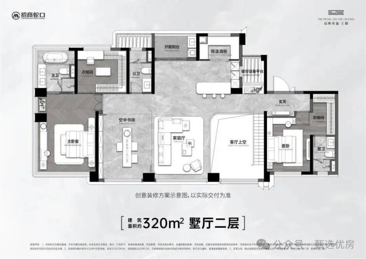约320㎡双跃三厅天空墅,打造佛山顶奢人居标杆产品,定位塔尖人群终极置业选择,采用双皇冠高厅设计,空间层次感十足,尽显大气恢弘;打造11.7米巨幕采光面,全屋采光通透,观景视野无死角;规划五房四套房设计,每一个卧室都配备独立卫浴,兼顾每一位家庭成员的居住私密性与舒适度,满足多代同堂、大家庭居住需求;跃层设计实现上下分层,动静分区、公私分区彻底,上层静谧居住、下层休闲会客,互不干扰,同时搭配超大观景空间,俯瞰千灯湖城芯全景,打造空中别墅级居住体验,是佛山顶豪市场的稀缺产品。