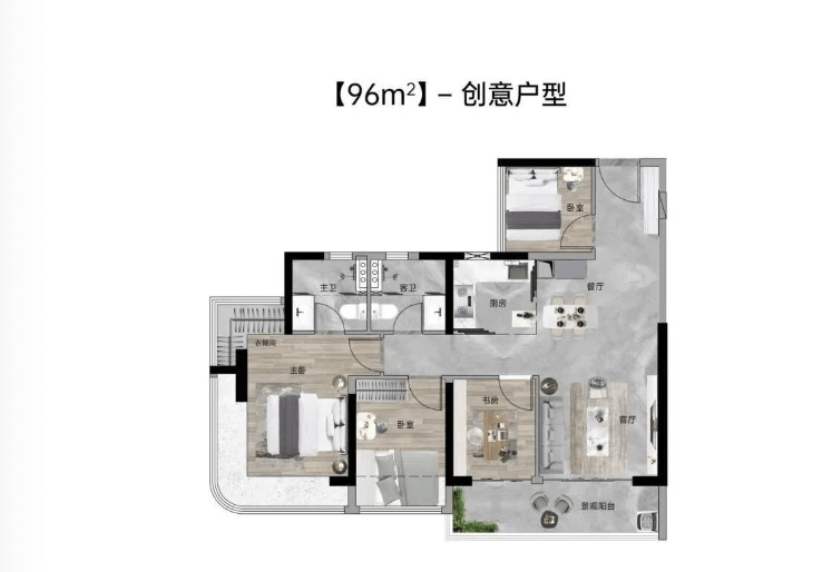 约96㎡ 三房两卫:2梯4户设计,使用率高达110%;南北通透,约6.1米景观阳台直瞰山景;主卧套间设计,配置独立衣帽间+豪华卫浴。