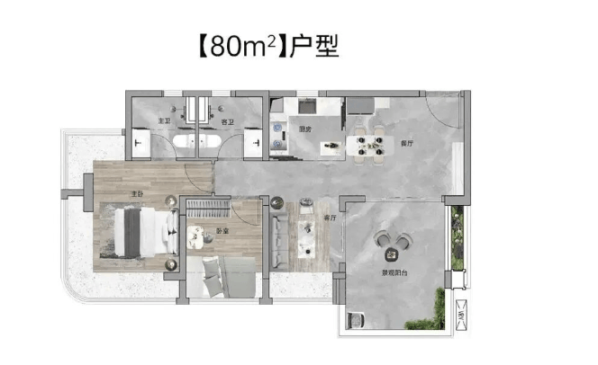 约80㎡户型:剩余60套,单价约4.0万-4.3万/㎡,总价约320万起;