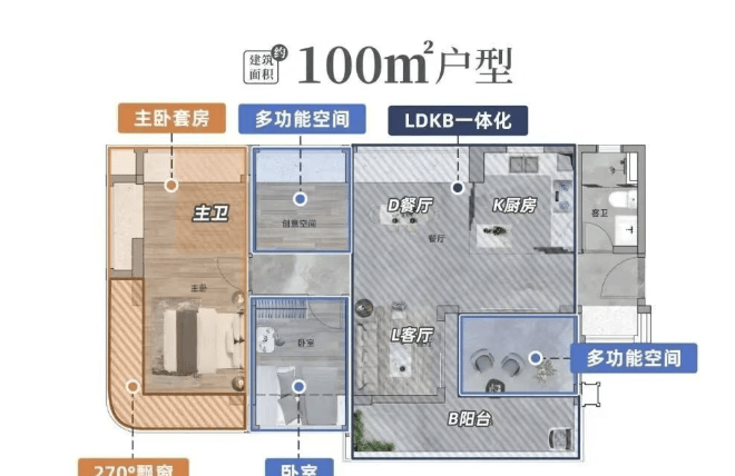 约100㎡ 三房两卫:2梯4户设计,使用率高达110%;配备入户花园,四开间朝南,空间灵活度高;主卧套间设计,配置独立衣帽间+豪华卫浴。