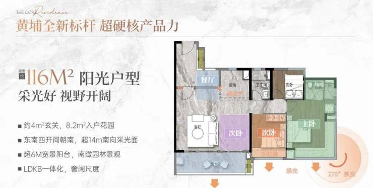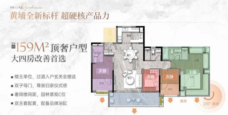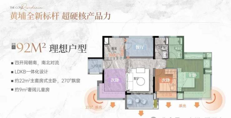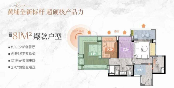 目前在售主力户型集中在81㎡、89㎡、92㎡、116㎡和159㎡五个面积段。以89㎡三房为例,采用竖厅布局,客厅带阳台,主卧带飘窗,厨房U型操作台面充足,两个次卧也能满足基本居住需求,适合首次置业或小家庭过渡。116㎡四房则做了南北通透设计,双阳台配置(生活阳台+景观阳台),主卧套房带独立卫生间,动线清晰,几乎没有浪费面积。159㎡大户型位于2号楼高区,部分单位西南向可远眺珠江新城天际线甚至广州塔,视野开阔。所有户型均采用明厨明卫,多数房间有自然采光,得房率在78%–82%之间,符合当前市场主流水平。
