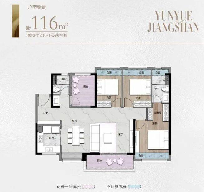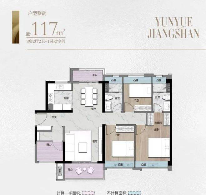 117㎡南北对流双阳台四房:该户型的亮点在于南北对流和双阳台设计。片区内少见的南北对流布局,使空气在室内形成自然流通,清风入室,保持室内空气清新。双阳台设计,一个用于晾晒衣物,另一个可打造为休闲空间,摆放桌椅,享受户外时光。一线朝南的设计,让客厅和卧室都能充分享受阳光。约 6.9 米横厅设计,增加空间开阔感,适合家庭聚会和休闲娱乐。四房设计满足家庭多样化居住需求,各房间尺度适宜,可根据家庭实际情况灵活布置。主卧空间宽敞,配备独立卫生间,提升居住品质。整体户型设计注重通风采光与空间利用,为家庭提供舒适、健康的居住环境。
