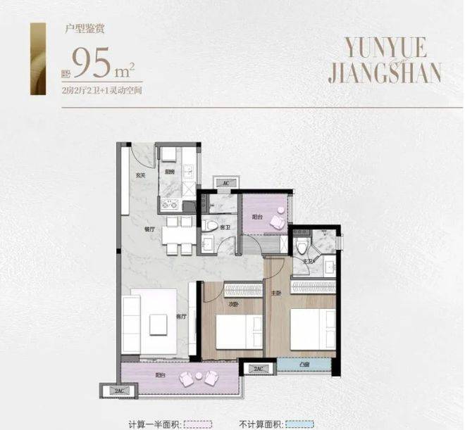 95㎡南向无敌视野大三房:该户型专为追求舒适与性价比的家庭设计。约 5.1 米双开间景观阳台,在片区内三房户型中独具优势,不仅增加采光通风,还可饱览户外美景,无论是清晨的阳光还是傍晚的余晖,都能尽情享受。双卫设计方便家庭成员使用,提升生活便利性。户型方正,空间布局合理,动静分区明确,休息区与活动区互不干扰。客厅与餐厅相连,营造出宽敞明亮的公共活动区域,适合家庭聚会与日常休闲。主卧空间宽敞,可放置大型衣柜,满足收纳需求。次卧和儿童房设计精巧,尺度适宜,可根据孩子的成长需求进行个性化布置。厨房采用 L 型设计,操作台面充足,洗、切、煮动线流畅,让烹饪更加便捷。整体户型设计紧凑而实用,为小家庭打造出舒适的居住环境。