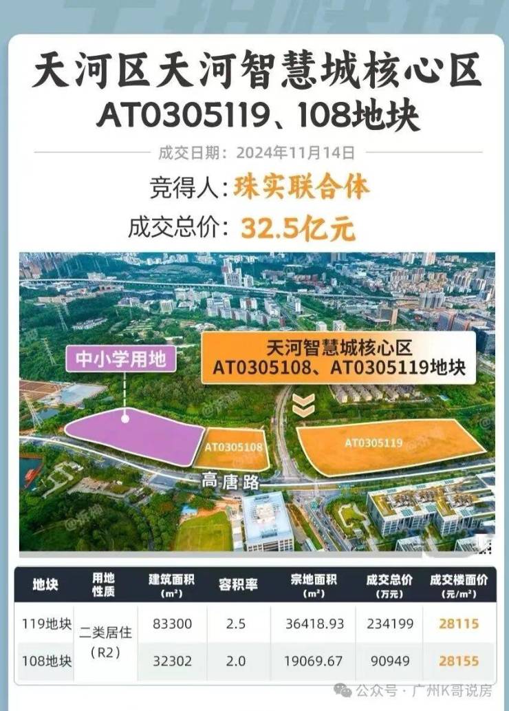 2024年11月14日天河智慧城核心区AT0305108、AT0305119两宗地块成功“出嫁”,由珠江实业+城投联合体拿下,成交总价32.5亿。