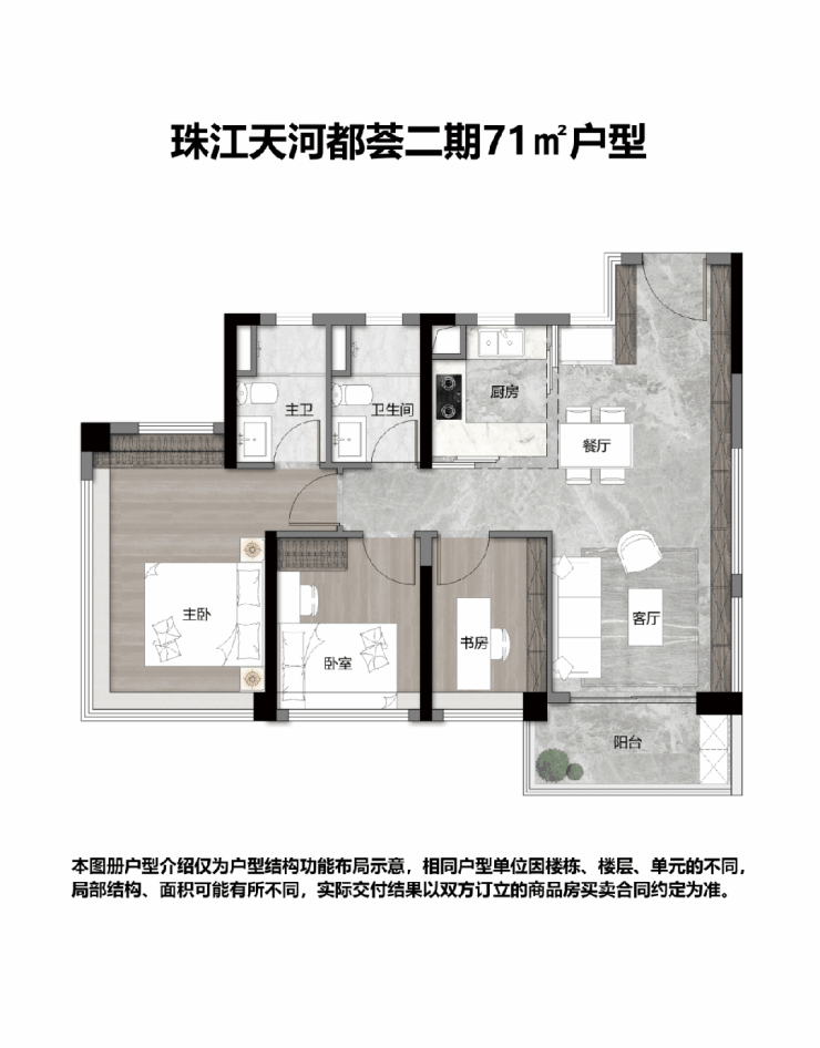 建面约72平三房,天河最小面积的双卫浴三房;