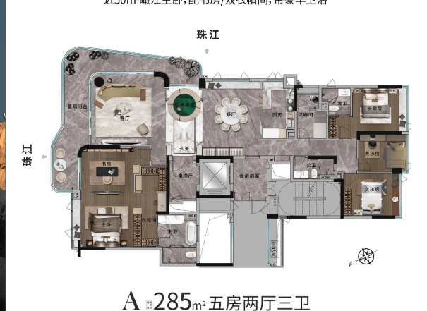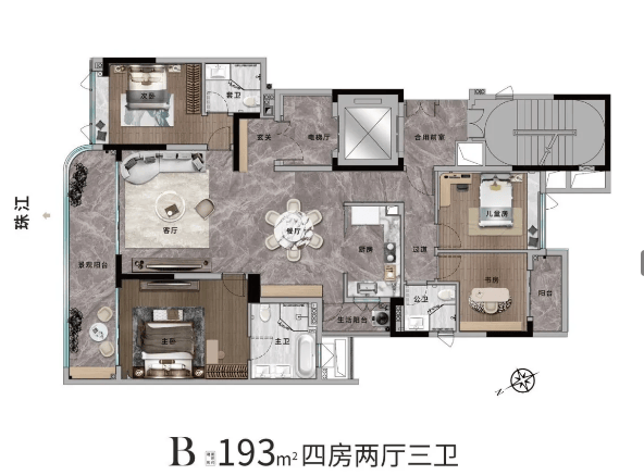 项目仅规划 193㎡与 285㎡两种瞰江大平层,全系专梯入户,确保私密性与仪式感。193㎡户型为改善首选,L 型一线珠江曲线阳台设计,400 米江景视野无遮挡,LDKB 一体化空间满足家庭互动需求,双主卧套房配备独立卫浴与步入式衣帽间;285㎡户型为顶豪配置,超大面宽客厅连接全景阳台,主卧套间面积超 40㎡,带独立梳妆区与奢华卫浴,部分户型可俯瞰三江交汇 “聚宝盆” 格局,居住尺度与景观体验均达顶级水准。