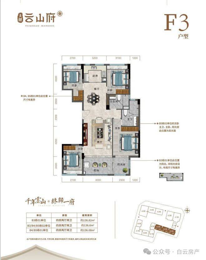 约136㎡F3户型采用两梯两户设计,南北通透,餐客厅分而不离,动线清晰。南向观景阳台尺度开阔,主套设有独立阳台及卫浴空间,增强居住尊崇感。阳光房与储藏空间的设置提升空间利用率,使家庭结构变化更具弹性。