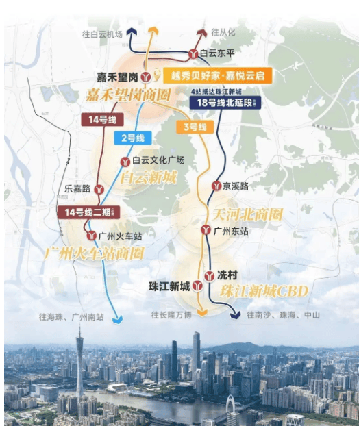 项目最大的交通优势的是“真地铁上盖”,楼下即为嘉禾望岗地铁站,该站点是广州中心城区为数不多的三轨交汇枢纽,汇聚地铁2号线、3号线、14号线,日均客流量超32万人次,排名广州前三,是广州北部最重要的交通枢纽之一。其中,地铁3号线直达白云机场、珠江新城、天河北等核心区域,地铁2号线连通白云新城、公园前等商圈与交通节点,地铁14号线衔接从化、花都等区域,实现南北贯通,半小时通勤圈覆盖广州核心区域,彻底解决上班族的通勤痛点。