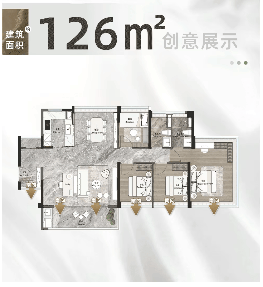 建面约126㎡五房两卫,属于高端改善户型,主打大空间、高舒适度,5.5开间朝南,四间卧室均朝南,采光效果拉满,南北对流设计,通风优良,彻底告别潮湿闷热。双面宽大阳台,客餐厅尺度阔绰,活动空间充足,适合大家庭居住;同样配备800库玄关,收纳能力强劲,满足大家庭的收纳需求;户型布局合理,动静分区明确,休息区与活动区互不干扰,既能保证家人的休息质量,又能满足日常家庭聚会、休闲娱乐等需求,舒适度与功能性全面拉满。