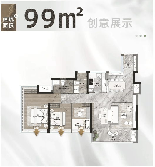 建面约99㎡四房两卫,主打改善型刚需与初级改善需求,户型设计亮点突出,采用IMAX宽景阳台、主卧三面环幕视野设计,室内就像一座移动的观景台,采光与景观视野极佳。3+1房灵活布局,必要时可将客厅旁边的多功能空间、景观阳台全部“合并”,形成完全无边界的“超聚厅”,满足家庭聚会、休闲娱乐等多元化需求;阳台尺度宽敞,可摆放茶具桌椅,煮茶品茗、坐看夕阳西下与城市璀璨灯火,惬意十足;主卧由传统L型飘窗升级为三面环幕设计,既增大了卧室空间,又提升了景观视野,兼具实用性与观赏性。