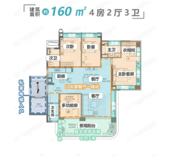 一期大平层户型:建面约160㎡户型,规划4室2厅2卫,空间布局方正通透,南北对流设计,保证室内采光与通风;客厅连接观景阳台,可欣赏山景与园林景观,拓展视野与活动空间;卧室均配备飘窗,主卧为套间设计,拥有独立卫生间与衣帽间,保障私密性与舒适度;LDK客餐厨一体设计,提升空间利用率,方便家庭互动。建面约184-190㎡户型,在160㎡户型基础上扩大空间尺度,规划4室2厅3卫,主卧套间升级,增加步入式衣帽间与独立卫浴,部分户型配备双空中观景庭院,观景视野开阔,可打造为休闲区、花艺区等,满足个性化需求。