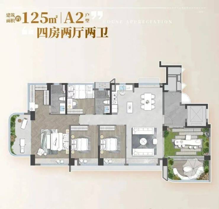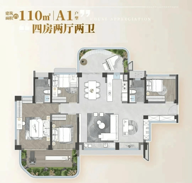 更大面积段如110㎡、125㎡户型,则将“空间魔法”发挥到极致。110㎡偶数层实用率高达141%,可实现4+1房布局,主卧自带14㎡私享花园;125㎡偶数层更打造5+1房格局,主卧连通近50㎡的空中庭院,堪比市中心豪宅大平层的奢阔体验。