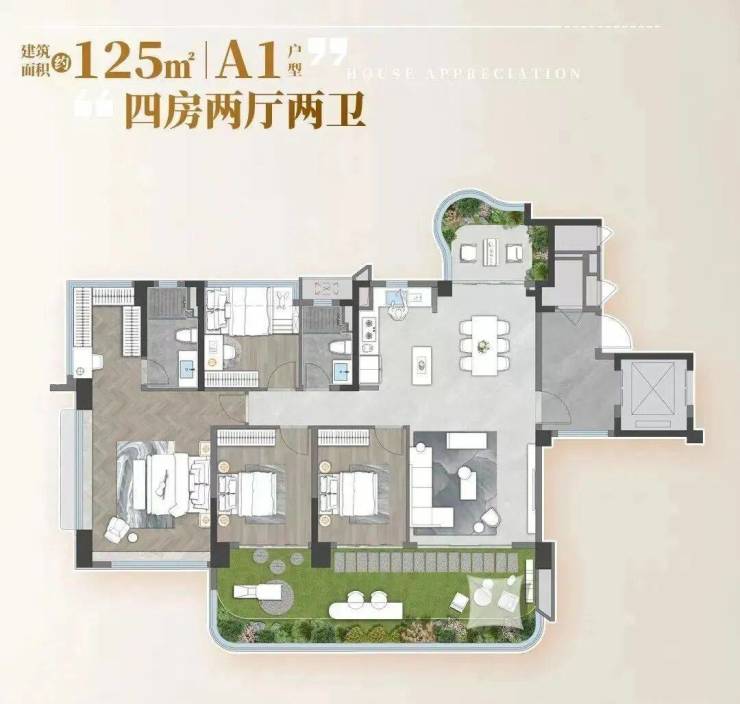 建面约125㎡偶数层,加上赠送实用率约140%,实用空间约177㎡,全屋5+1房设计,入户就是餐客厅,客厅与空中花园联通,空间的打造是灵活的,可以作茶室或娱乐房,主卧拥有独立的衣帽间,加上连接的空中花园,拥有近50㎡的私享空间,完全是豪宅大平层的奢阔感。