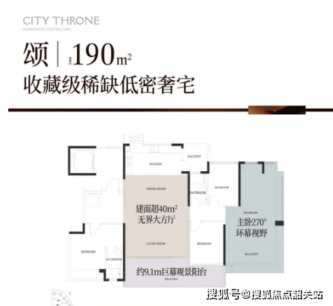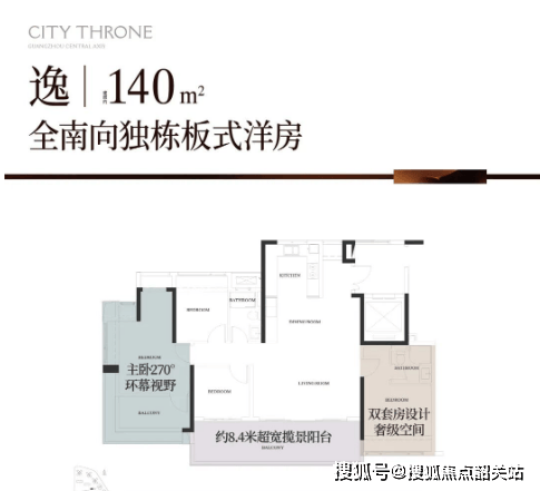 目前主要在售的户型有 120-143 平的塔楼户型,以及 140-190 平的板楼户型,还有全盘仅有的一栋楼王 T5 栋,户户都是约 240 平的千万级大平层。以 140 平的板楼户型为例,该户型采用 2 梯 2 户设计,层高 3 米,纯南向板楼设计,通风采光极佳。户型设计为四开间朝南,配有 270° 飘窗和约 8.4 米南向巨幕阳台,能最大程度引园景入室,同时还可远眺白云山景观。此外,该户型还采用了双南向套房设计,即使和父母生活在一起,也能保证各自的生活空间和隐私。