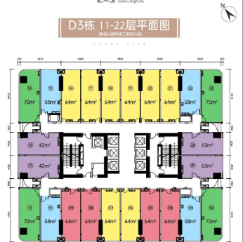 户型设计:主推46-145㎡二至五房LOFT,全部做到5米层高,可分上下两层设计,部分户型更带双钥匙设计,独立入户不打扰,买一套可得两套。例如: