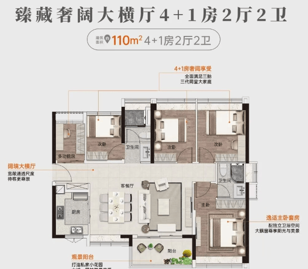 建面约110㎡:5房2厅2卫,打造私家小花园,全面满足三胎或三代同堂大家庭需求。