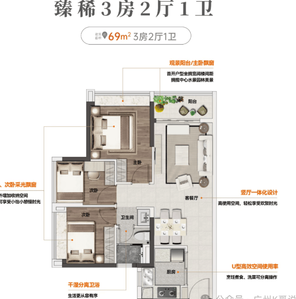 建面约69㎡:3房2厅1卫,阔绰观景阳台,主次卧采光飘窗,干湿分离卫浴,U型厨房。