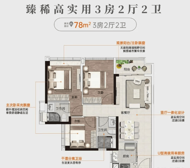 建面约78㎡:3房2厅2卫,无遮挡阔境视野空间,高实用空间设计,额外增加收纳空间。