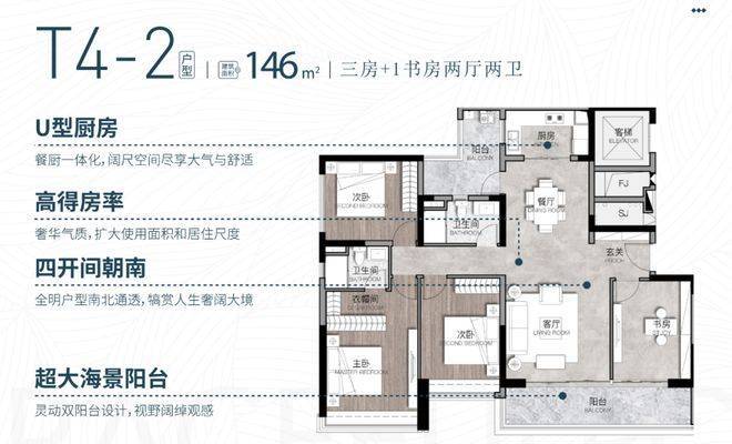 146㎡ 三房+1书房两厅两卫 户型(平层)