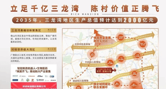 宏宇公馆地处广佛同城化的核心区域,位于佛山市顺德区陈村镇。该区域是三龙湾的重要组成部分,也是广佛都市圈的核心地带。项目坐享广州南站商圈及三龙湾产业发展的千亿人流辐射,地理位置极为优越。随着广佛同城化进程的不断推进,这一区域的发展潜力巨大。