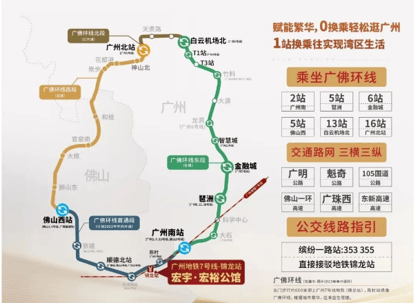 宏宇公馆紧邻广州地铁7号线锦龙站,步行约500米即可到达地铁口,仅需3分钟路程。通过地铁,可以快速抵达广州南站,进而连接粤港澳大湾区各大城市。此外,项目附近还有佛山地铁2号线和广佛环线城轨,形成了一个立体的轨道交通网络。高速和大桥方面,东新、广珠西、广台等多条高速公路以及海华大桥和番湾大桥(规划中)也为居民提供了便捷的出行条件。