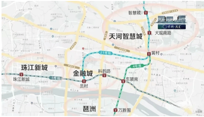 地铁:距离 21 号线大观南路站约 1.2 公里,步行约 15 分钟,虽有一定距离,但可借助小电车接驳。通过地铁,一站可换乘 4 号线前往金融城、琶洲,4 站到员村换乘 5 号线直抵珠江新城,方便快捷地通达城市核心区域。