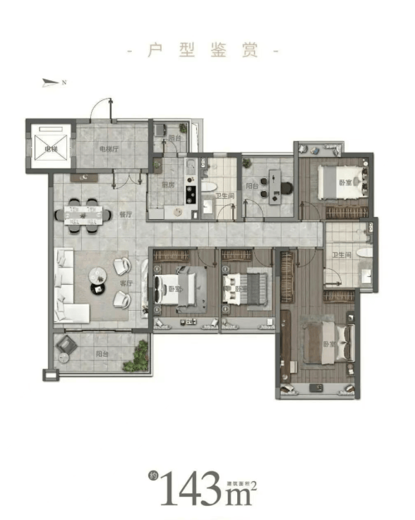 9层稀缺小高层产品:143㎡五房采用1梯2户尊崇配置,东南向瞰中心园林与山湖盛景。