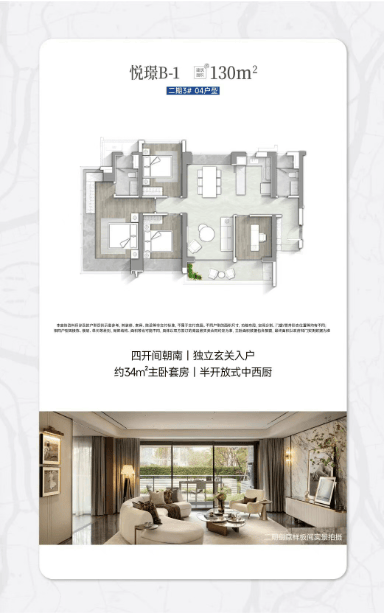 一期·悦璟B户型(建面约123㎡):该户型以“LDKG一体化”设计为核心,将客厅、餐厅、厨房、阳台融为一体,形成约6.6米的双面宽景观阳台,最大化引入景观与采光。半开放式中西厨搭配中岛,既满足中式烹饪习惯,又增添西式社交乐趣。主卧套房设计,带有独立梳妆台与主卫,私密性极佳。