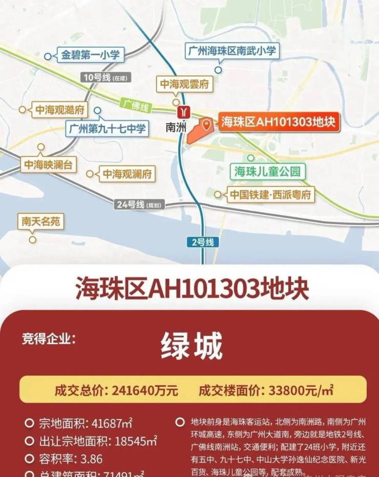 2024年12月5日,海珠老城区的海珠客运站地块成功出让,绿城以约24.16亿元总价拿下,折合楼面价约3.38万/㎡(未扣除配建)。这一区域是海珠区近十年来最为优质的地块之一,地理位置优越,遥望广州塔、海心沙等知名地标。凭借其独特的地理优势和丰富的自然景观资源,该区域成为打造高端居住项目的理想选择。